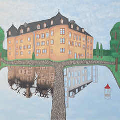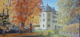 Der Künstler liefert einen Blick aus dem Schlosspark auf Schlossteich und Schloss.