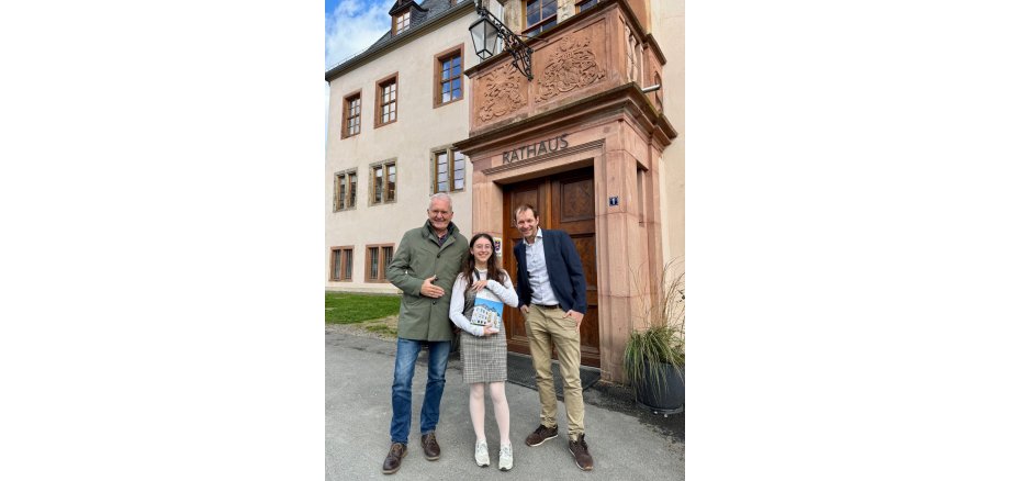 Das Bild zeigt von l.n.r.: Bürgermeister Andreas Weiher, Praktikantin Thaïs Hélou-Pruvôt und Praktikumsbetreuer Nikolai Kailing