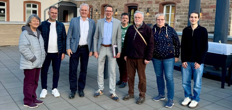 Bildunterschrift: Bürgermeister Andreas Weiher (3.v.l.) mit Kultur-Staatssekretär Christoph Degen (4.v.l.) auf der Terrasse des Alten Amtsgerichts