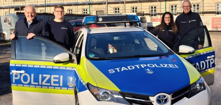 Unser Bild zeigt v.l.n.r. Bürgermeister Andreas Weiher mit den Stadtpolizisten Marcel Riedl, Sonja Jorek und Burkhard Baumgarten.